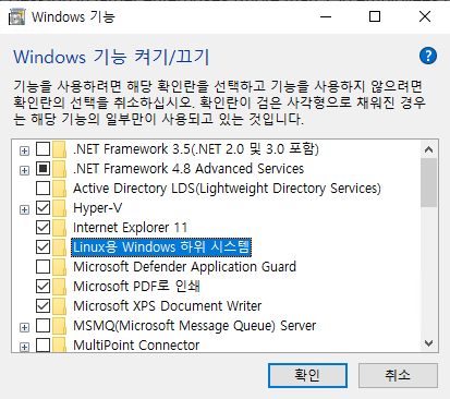 참고로 Docker Desktop의 원활한 실행을 위해서는, Windows 기능 켜기/끄기에서(작업표시줄 검색창으로 검색하면 됩니다) Linux용 Windows 하위 시스템을 켜 줘야 한다!