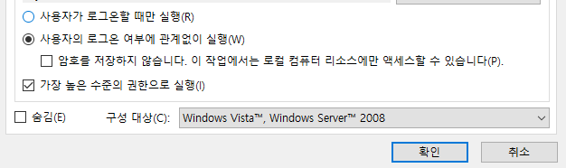 마지막으로 최종 확인하기 전, 일반 탭에서 사용자의 로그온 여부에 관계없이 실행과, 가장 높은 수준의 권한으로 실행을 체크해주고 확인 버턴을 누르면 저장 된다.