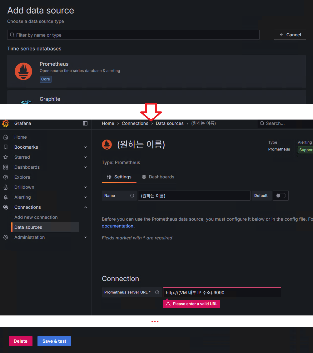 Prometheus server URL에 http://VM 내부 IP:9090를 입력하여 아래 Save & test를 눌렀을 때 정상적으로 저장 되면 끝이다.