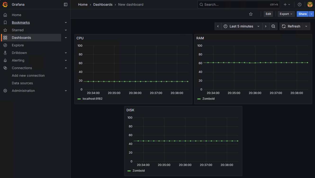 대쉬보드 구성은 간단하게 CPU/RAM/DISK 만 하였다. 현재로서는 많아봤자 10여 명이 들어오는 서버인만큼, 네트워크 대역폭 등보다는 이 셋이 가장 중요했기 때문이다.