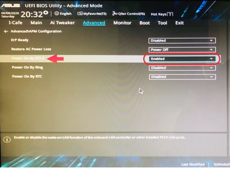 당직이 쓰는 아수스 메인보드 기준으로, Advanced 탭의 Advanced\APM Configuration 항목에 들어가 Power On By PCI-E를 Enable로 바꿔주면 된다.