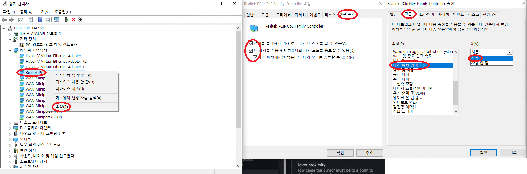그 다음에는 고급 탭에 들어가 매직 패킷 웨이크 온을 사용으로, 전원 관리 탭에서 모든 항목에 체크해주면 된다.