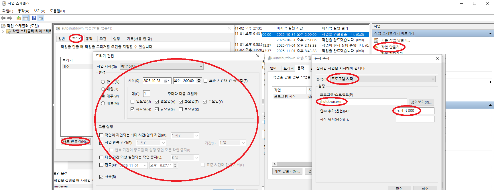 하면 트리거에서 설정한 시간 때마다 동작에서 지정한 shutdown이 동작해서 자동 종료할 수 있다.