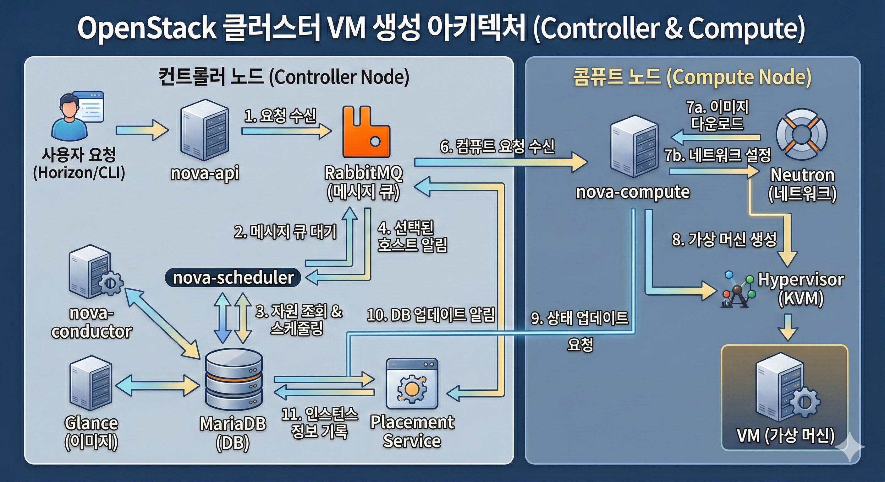 - 이 때 nova-compute는 glance에서 이미지를 가져오고, cinder에서 스토리지를 할당하며, neutron에서 네트웤을 설정하도록 요청을 보낸다. (콘트롤러 노드)