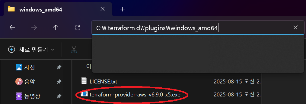 C:\.terraform.d\plugins\ 경로에 압축 푼 폴더를 넣으면 된다.