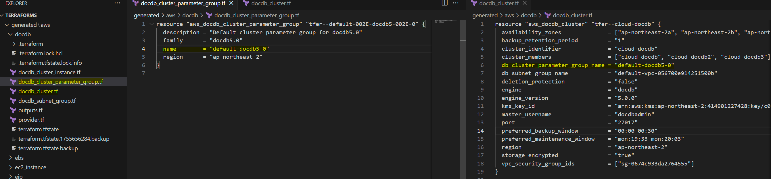 docdb를 임포트할 때 나오는 docdb_cluster_parameter_group.tf는 docdb의 파라메터 그룹을 생성하는 부분인데, 어차피 당직들은 aws에서 기본 제공하는 파라메터 그룹(default.docdb5.0)을 사용할 것이다.