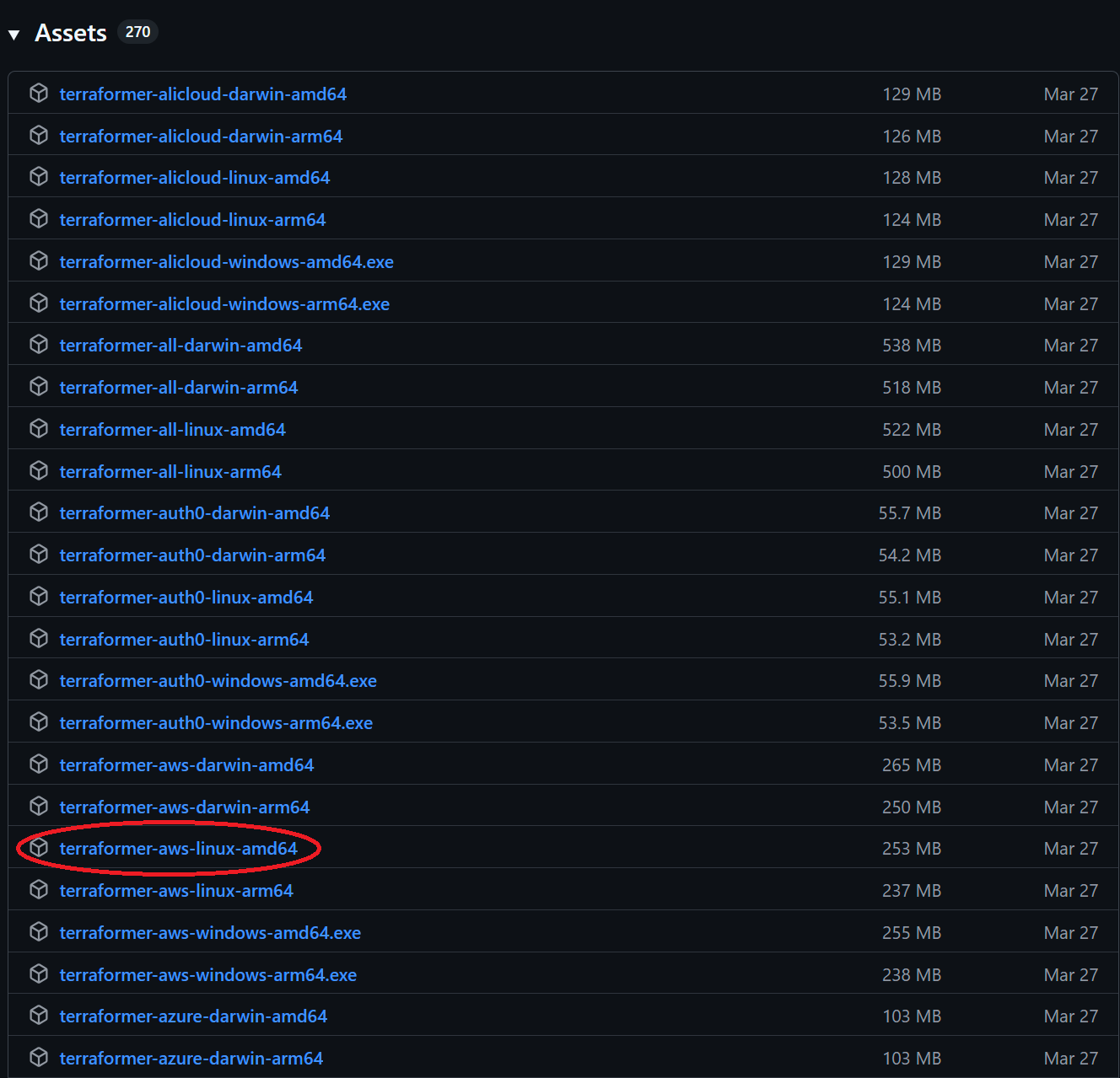 테라포머도 마찬가지로 여기에 들어가서 Asset 항목에서, 맞는 terraformer-클라우드-운영체제-cpu아키텍춰.exe를 받아주면 된다.