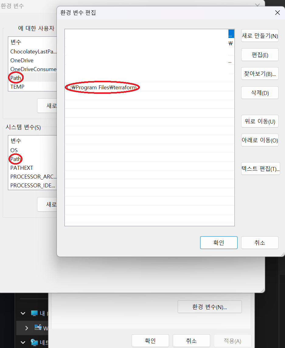 환경 변수(시스템,유저 다)의 Path에 terraform.exe 파일 경로를 입력해주는 식으로 수동 설치해 줘야 한다.