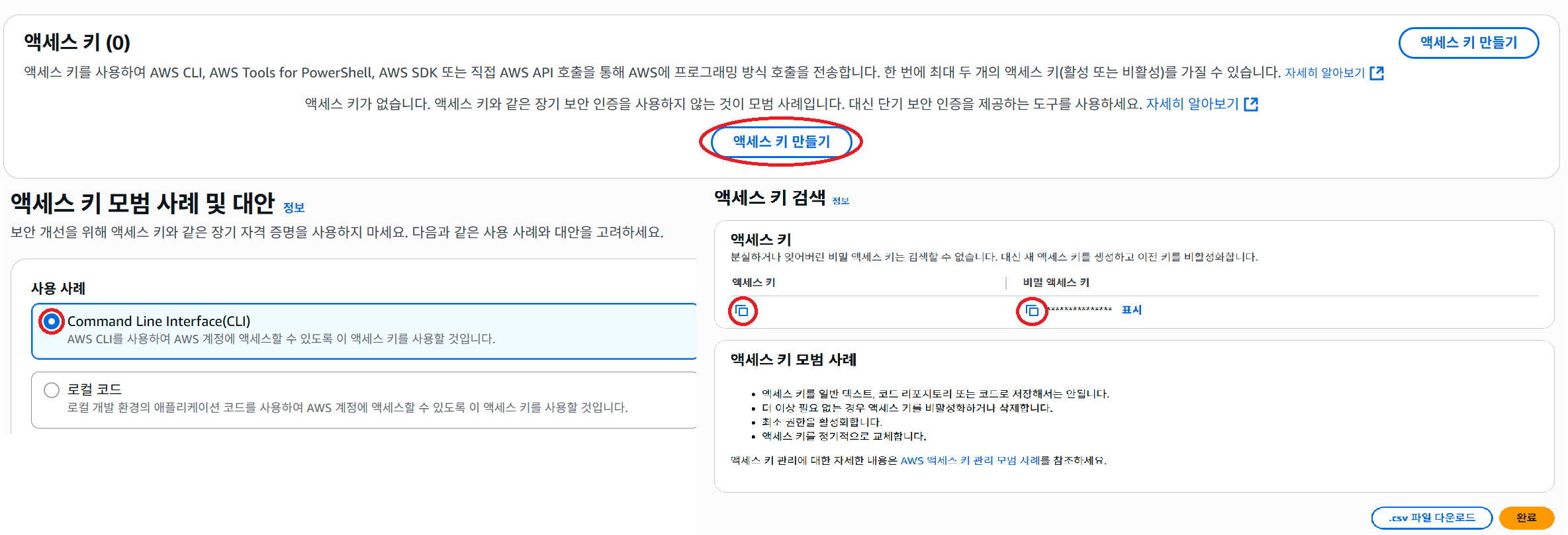 그러면 액세스 키와 비밀 액세스 키가 나오는데 이건 이 화면을 벗어나면 평생 볼 수 없으므로 미리 복사해 준다.