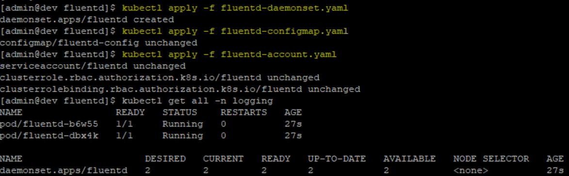 플루언트디는 좀 많이 해맸다. 이것도 지난번의 kube-state-monitoring 설치 때처럼 쿠버 pod에 붙기 때문에, serviceaccount와 같은 복잡한 설정을 해 줘야 한다.