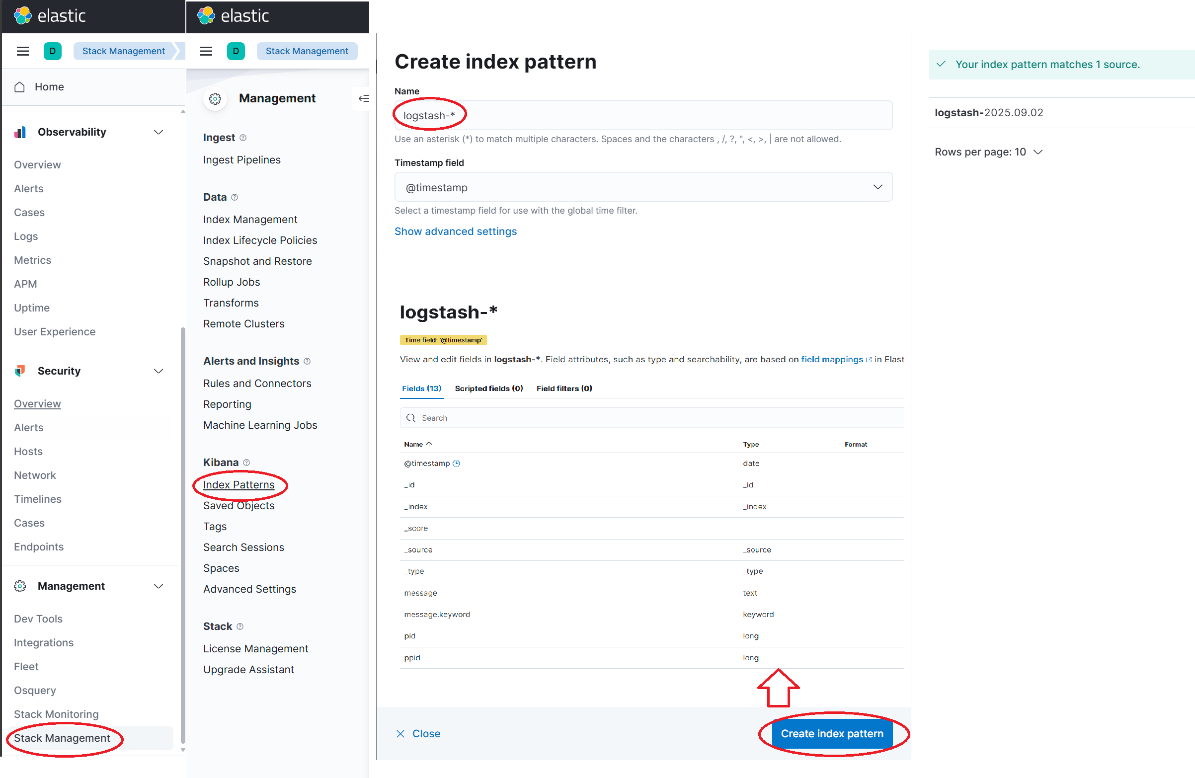 새 창이 나오면 또 왼쪽 바의 Index Patterns를 선택하면 Create index pattern 창이 뜨는데,