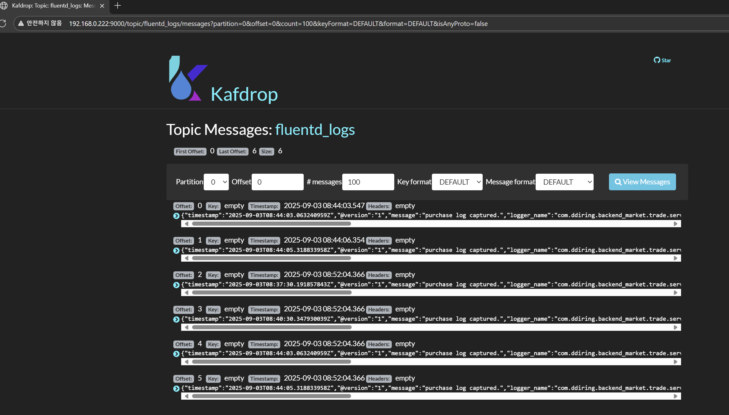 fluentd_logs토픽으로 전달되도록 설정했다.